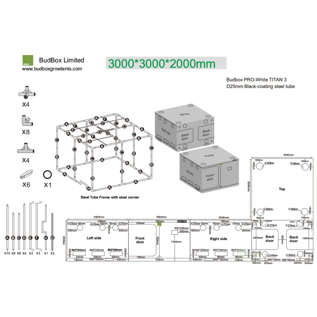 Budbox PRO Titan III 300 jest przeznaczony do wszystkich rodzajów oświetlenia (HPS, MH, CFL, LED, CMH, DE). Wykonany w 100% z nieprzezroczystego, 4-warstwowego materiału, który jest nietoksyczny, oraz z metalowej konstrukcji z wysokiej jakości wykończeniem. Namioty BudBox są teraz wyposażone w stalowe złącza push & click fit, które oprócz mocniejszych hartowanych stalowych słupów zapewniają większą wytrzymałość dla wszystkich filtrów, wentylatorów i wymagań oświetleniowych. Nowy model PRO posiada ulepszenia, takie jak nowe opatentowane nieprzezroczyste zamki, metalowe łączniki i dolna rama specjalnie przystosowana do odprowadzania wody. Ponadto namiot nie posiada dolnych poprzecznych rurek i ma płaskie dno. Jego przepusty wentylacyjne są teraz szersze (można używać przewodów sonicznych). Namiot jest wyposażony w unikalne okno obserwacyjne z zielonej folii, dzięki któremu można obserwować rośliny, nawet gdy śpią. Dla rury odpływowej przewidziano specjalnie podwyższoną dolną ramę.