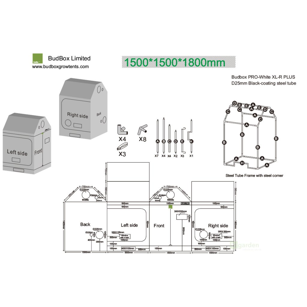 Budbox PRO XL+ R 150 jest przeznaczony do oświetlenia HPS i LED. Wykonany w 100% z nieprzezroczystego, 4-warstwowego materiału, który jest nietoksyczny, oraz z metalowej konstrukcji z wysokiej jakości wykończeniem. Namioty BudBox są teraz wyposażone w stalowe złącza push & click fit, które oprócz mocniejszych hartowanych stalowych słupów zapewniają większą wytrzymałość dla wszystkich filtrów, wentylatorów i wymagań oświetleniowych. Nowy model PRO posiada ulepszenia, takie jak nowe opatentowane nieprzezroczyste zamki, metalowe łączniki i dolna rama specjalnie przystosowana do odprowadzania wody. Ponadto namiot nie posiada dolnych poprzecznych rurek i ma płaskie dno. Jego przepusty wentylacyjne są teraz szersze (można używać przewodów sonicznych).
