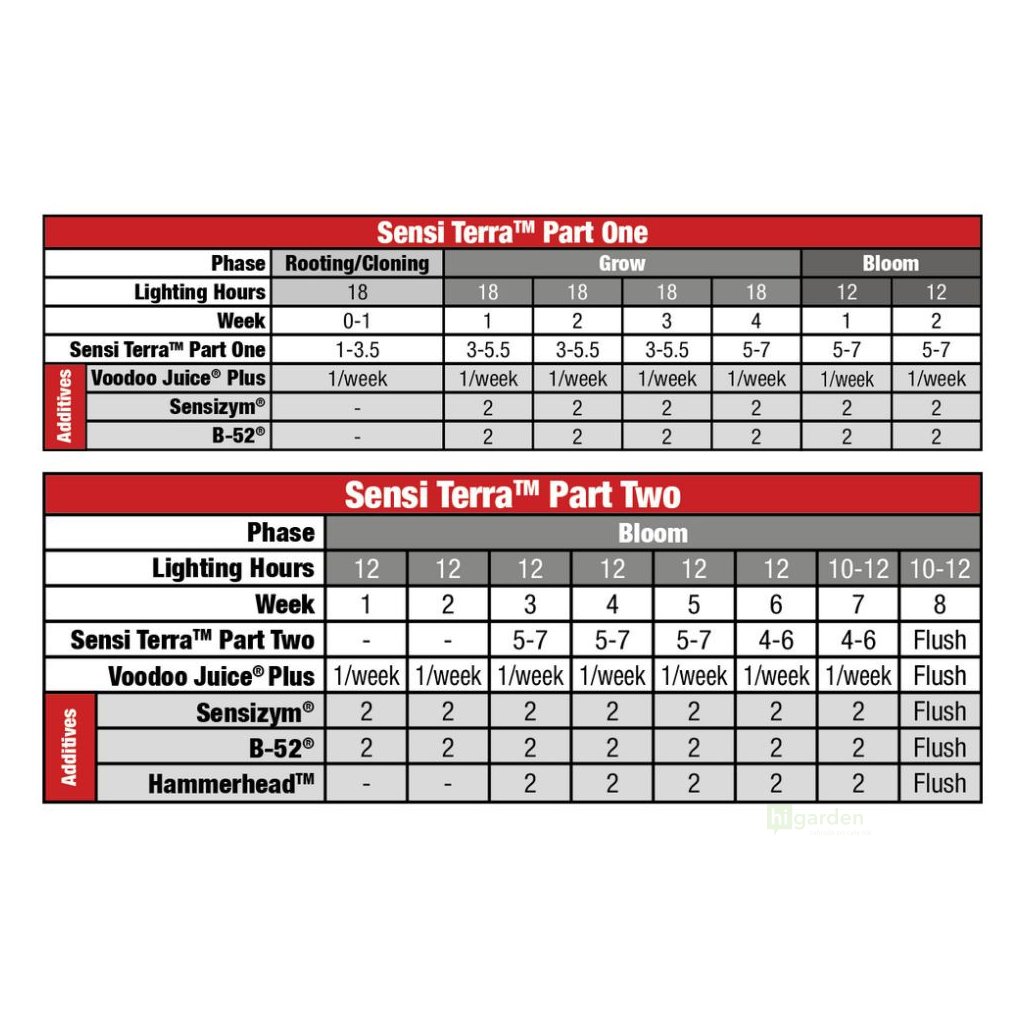 Advanced Nutrients Sensi Terra to podstawowy nawóz, specjalnie zaprojektowany do stosowania zarówno z twardą, jak i miękką wodą, w glebie wstępnie nawożonej oraz w mieszankach bezglebowych. Stosuj w zakresie 1 - 7 ml/l od fazy klonowania/siewu do końcowego płukania. Nawóz nadaje się do upraw wewnętrznych i zewnętrznych. Dodawaj według potrzeb 2 - 4 razy w tygodniu. W przypadku włókna kokosowego lub hydroponiki: stosuj codziennie (wymagane jest dodatkowe uzupełnienie wapnia). Przed użyciem dobrze wstrząśnij i nie przekraczaj zalecanych dawek.