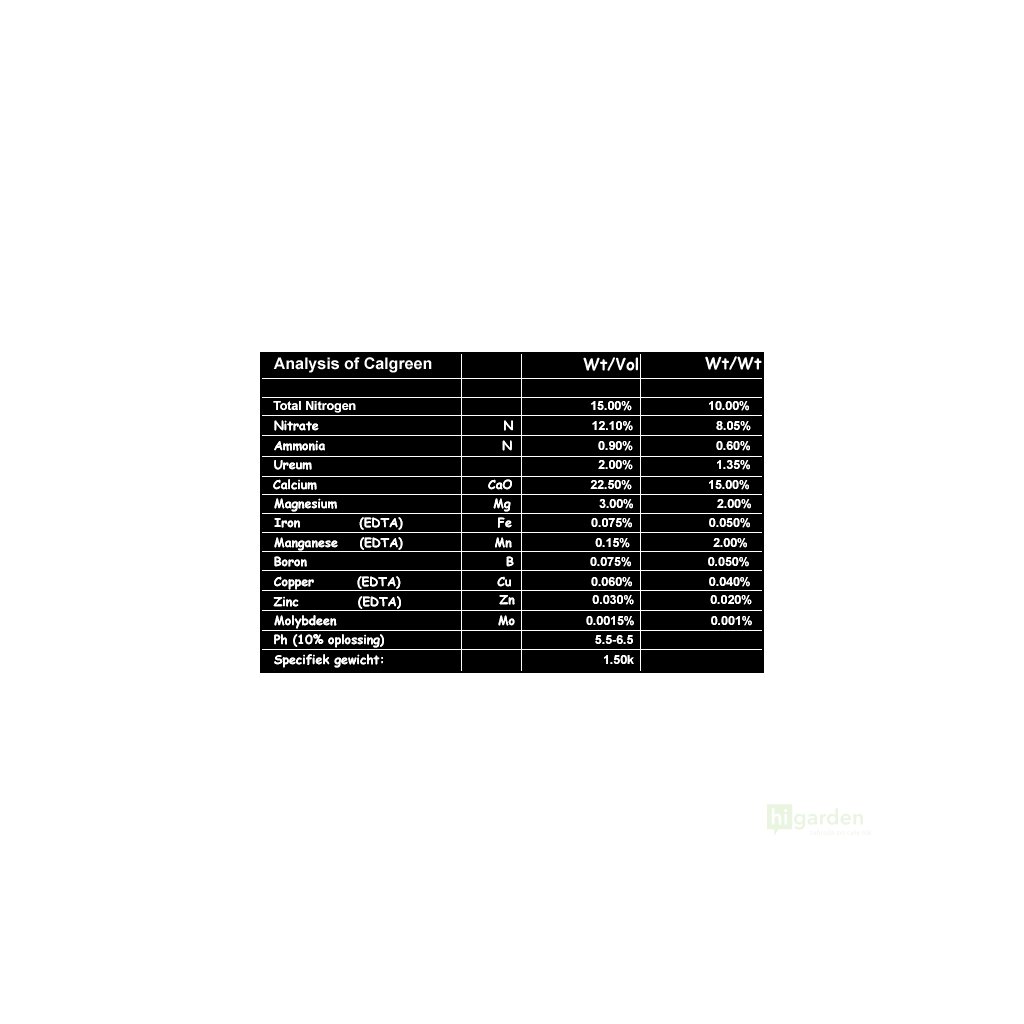 Metrop Calgreen wyróżnia się połączeniem azotu i wapnia, które są budulcem ścian komórkowych. Stosując Metrop Calgreen, uzyskasz bardzo gęste kwitnienie. Calgreen jest również przede wszystkim używany w 80% jako ochrona przed pleśnią i gniciem. Ten nawóz składa się z wysokiej jakości substancji podstawowych i może być mieszany ze wszystkimi produktami Metrop.