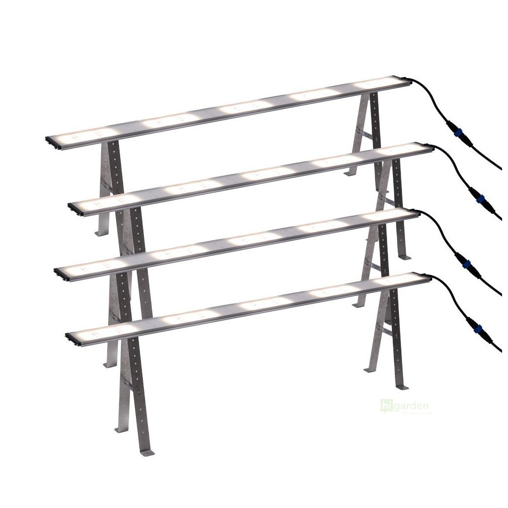 Podstawą zestawu są cztery lampy Undercanopy STIXX 5-120, które zapewniają idealne pokrycie powierzchni 120x240 cm, a ich wymiary doskonale odpowiadają szerokości standardowych namiotów uprawowych. Zestaw jest zaprojektowany jako funkcjonalna całość i zawiera odpowiedni sterownik, rozgałęźniki oraz okablowanie, dzięki czemu instalacja jest szybka i nie wymaga skomplikowanego doboru kompatybilnych komponentów. Konstrukcja lamp z klasą szczelności IP68 zapewnia niezawodne działanie nawet w środowisku o podwyższonej wilgotności. Natężenie oświetlenia można wygodnie regulować za pomocą ściemniacza SANlight, który jednak nie jest częścią zestawu i należy go dokupić osobno do zasilacza.
