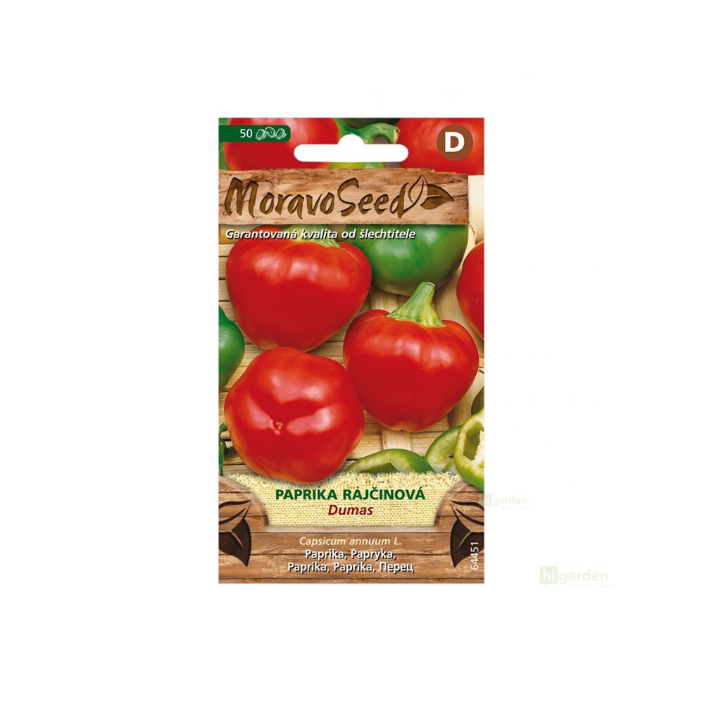 Opakowanie nasion papryki warzywnej Dumas od Moravo Seed zawiera 50 nasion. Wczesna do średnio wczesnej odmiana pomidorowa charakteryzuje się sercowatymi owocami w kolorze ciemnoczerwonym i zielonym.