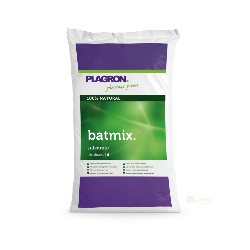 Plagron Batmix to wysokiej jakości mieszanka zawierająca najlepsze rodzaje torfu. Ten wstępnie nawożony substrat składa się z torfu białego, torfu czarnego, torfu włóknistego, perlitu, wermikompostu, organicznych nawozów NPK w proporcji 3-15-4 i nietoperzowego guano. Obecny perlit i torf włóknisty poprawiają strukturę, zwiększają napowietrzenie, lekkość i natlenienie. Odpowiednia ilość wermikompostu Plagron zapewnia silny wzrost roślin i zwiększa zdolność zatrzymywania wody. Głównym źródłem składników odżywczych w Batmix jest nietoperzowe guano, które zawiera fosfor i potas, co gwarantuje bardzo dobry wzrost roślin.