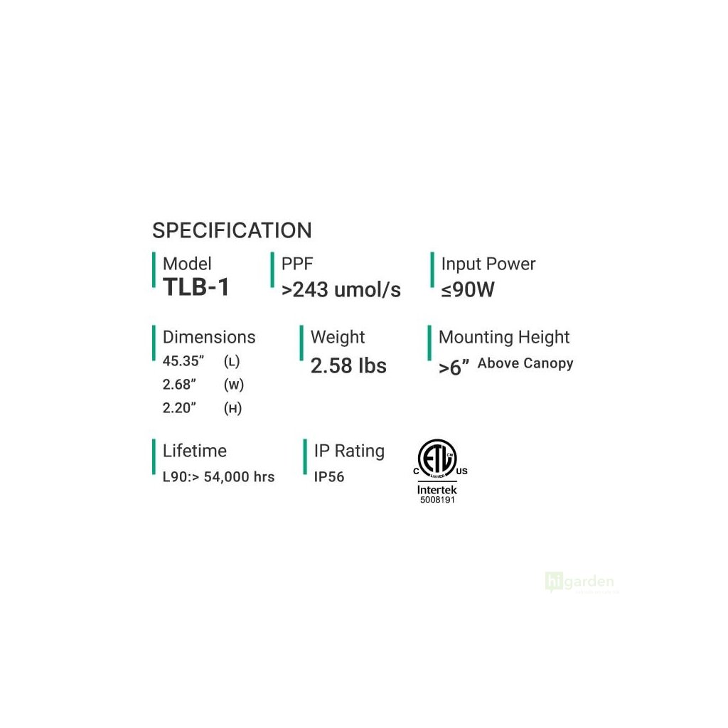 Po podłączeniu do sterownika TrolMaster TLB-1 może naśladować właściwości naturalnego światła słonecznego, umożliwiając użytkownikowi dostosowanie rzeczywistego spektrum światła. Każdy TLB-1 zapewnia 90 watów światła, skutecznie zaspokajając potrzeby WSZYSTKICH faz, od wegetacji po kwitnienie.