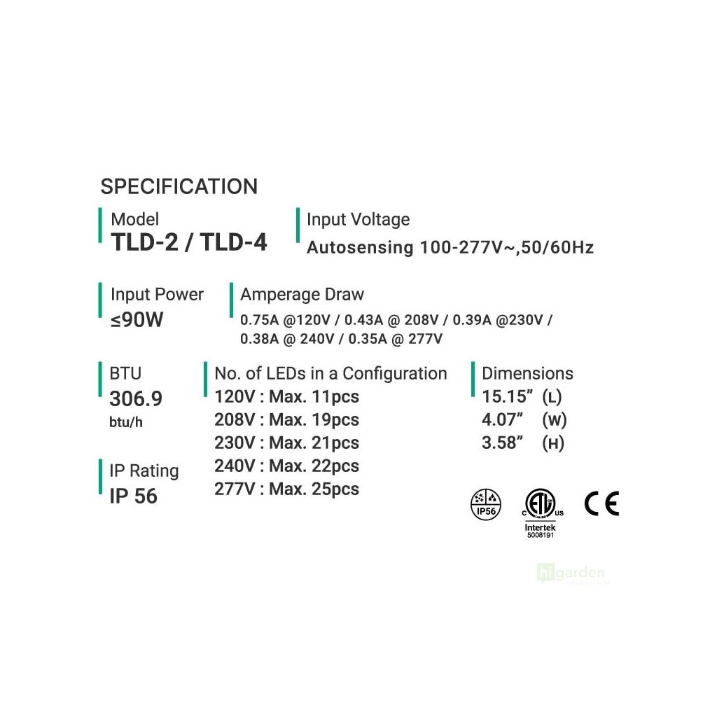 Jest wyposażony w cztery kanały do sterowania spektrum i można go podłączyć do jednostki sterującej TrolMaster HCS lub TCS, co umożliwia zdalne sterowanie i niezależne ustawienie każdego z czterech kanałów. Daje to możliwość dostosowania spektrum oświetlenia i harmonogramu czasowego. TLD-4 współpracuje z listwami LED TLB-1 o długości 4 stóp lub listwami LED TLB-2 o długości 5 stóp firmy ThinkGrow.