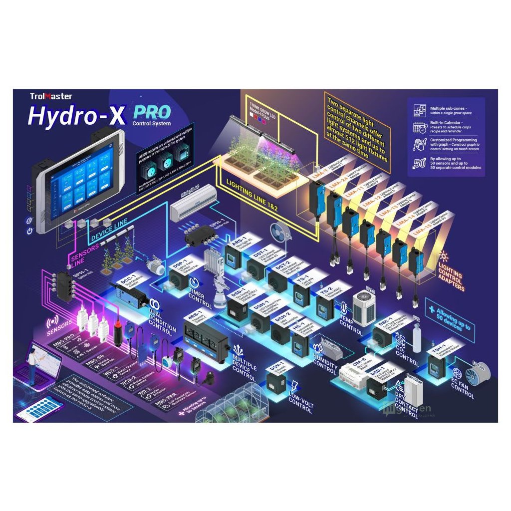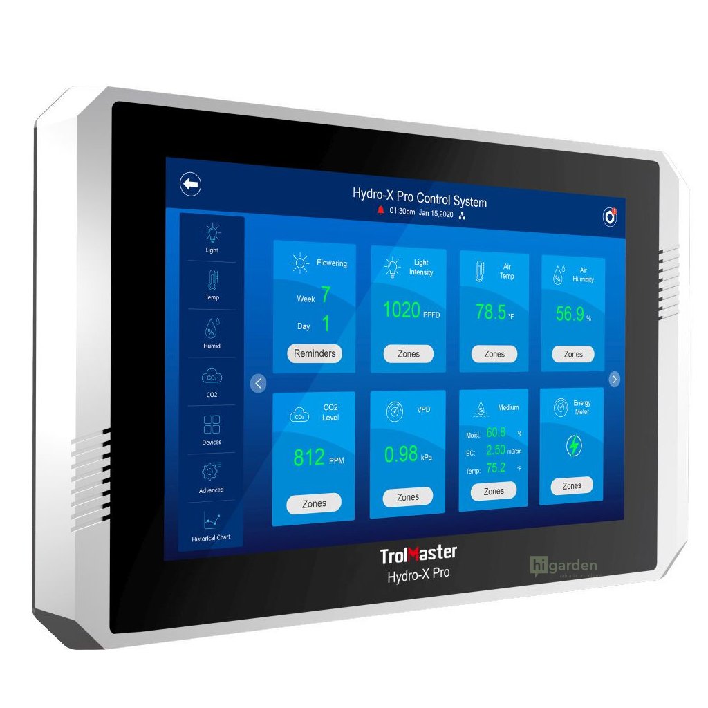TrolMaster kontynuuje rewolucję dzięki 10-calowemu ekranowi dotykowemu i oprogramowaniu internetowemu. Hydro-X Pro jest również wstecznie kompatybilny ze wszystkimi istniejącymi modułami sterowania / urządzeniami Hydro-X. Zapewnia większą elastyczność i pozwala na adresowanie dowolnego modułu w taki sposób, jaki życzy sobie użytkownik. Użytkownik może również ustawić każdy moduł tak, aby miał wiele "warunków", które aktywują moduł, co pozwala na niemal nieograniczone możliwości sterowania.