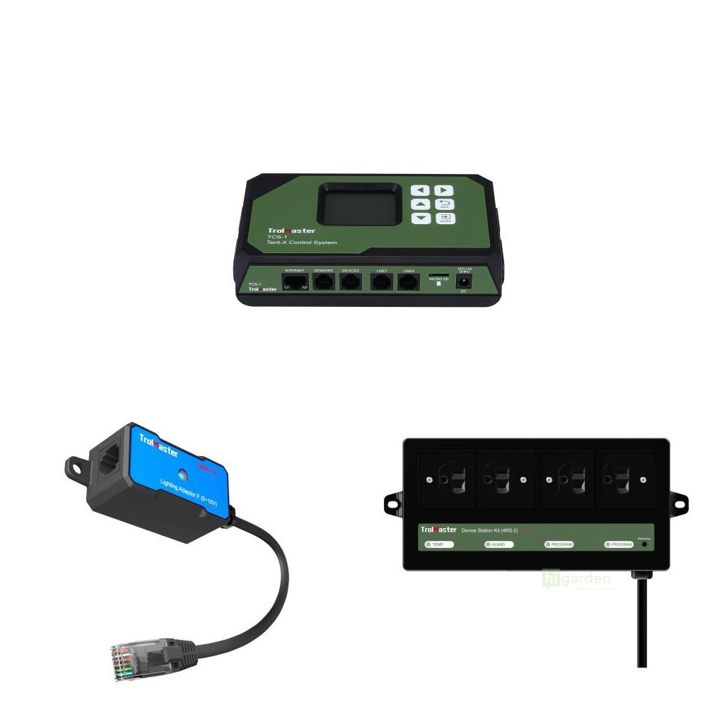 Trolmaster Set Tent-X Basic zawiera kontroler Trolmaster Tent-X Main Controller 3-in-1 Sensor (TCS-1), Trolmaster Device Station Kit zawierający 1x DST, 1x DSH, 2x DSP (4RS-2E) oraz Trolmaster Lighting Control Adapter F dla protokołu 0-10V (LMA-14).