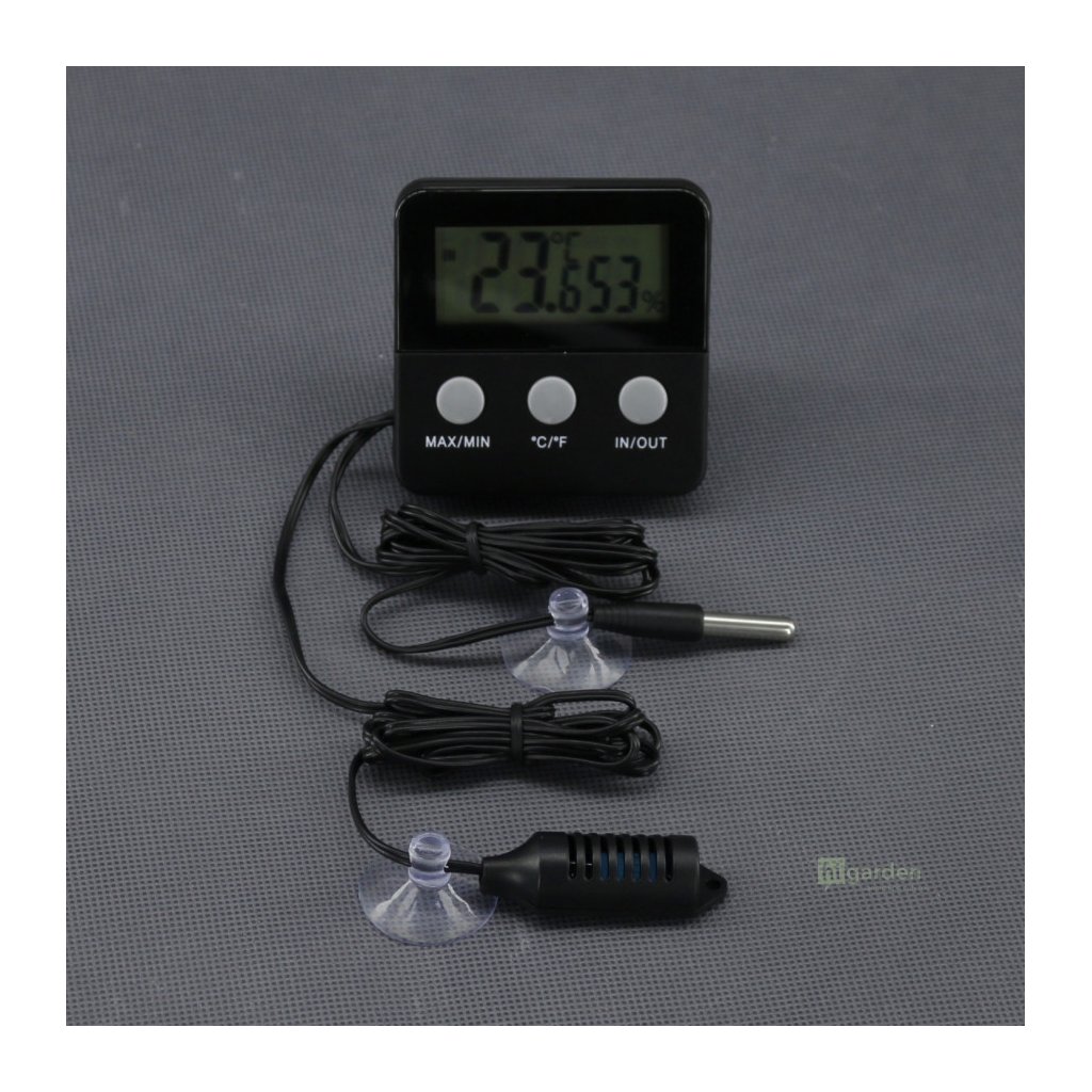 Termometr służy do pomiaru i wyświetlania temperatury. Wilgotnościomierz mierzy i wyświetla wilgotność. Wszystkie zmierzone wartości są wyświetlane na przejrzystym wyświetlaczu LCD. Zakres pomiaru temperatury wewnętrznej -10° do 50°C, temperatury zewnętrznej -50° do 70°C. Zakres pomiaru wilgotności zewnętrznej 20% do 99%RH. Wyświetlanie temperatury w °C lub °F i wilgotności w %RH (wilgotność względna). Wyświetlanie minimalnych i maksymalnych wartości z możliwością wymazania. Każdy zewnętrzny czujnik przewodowy o całkowitej długości sondy 1 metr. Do mocowania czujnika służą przyssawki. Zasilanie urządzenia zapewnia jedna bateria AAA.