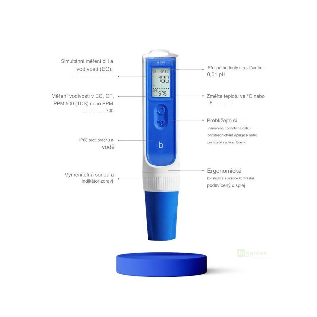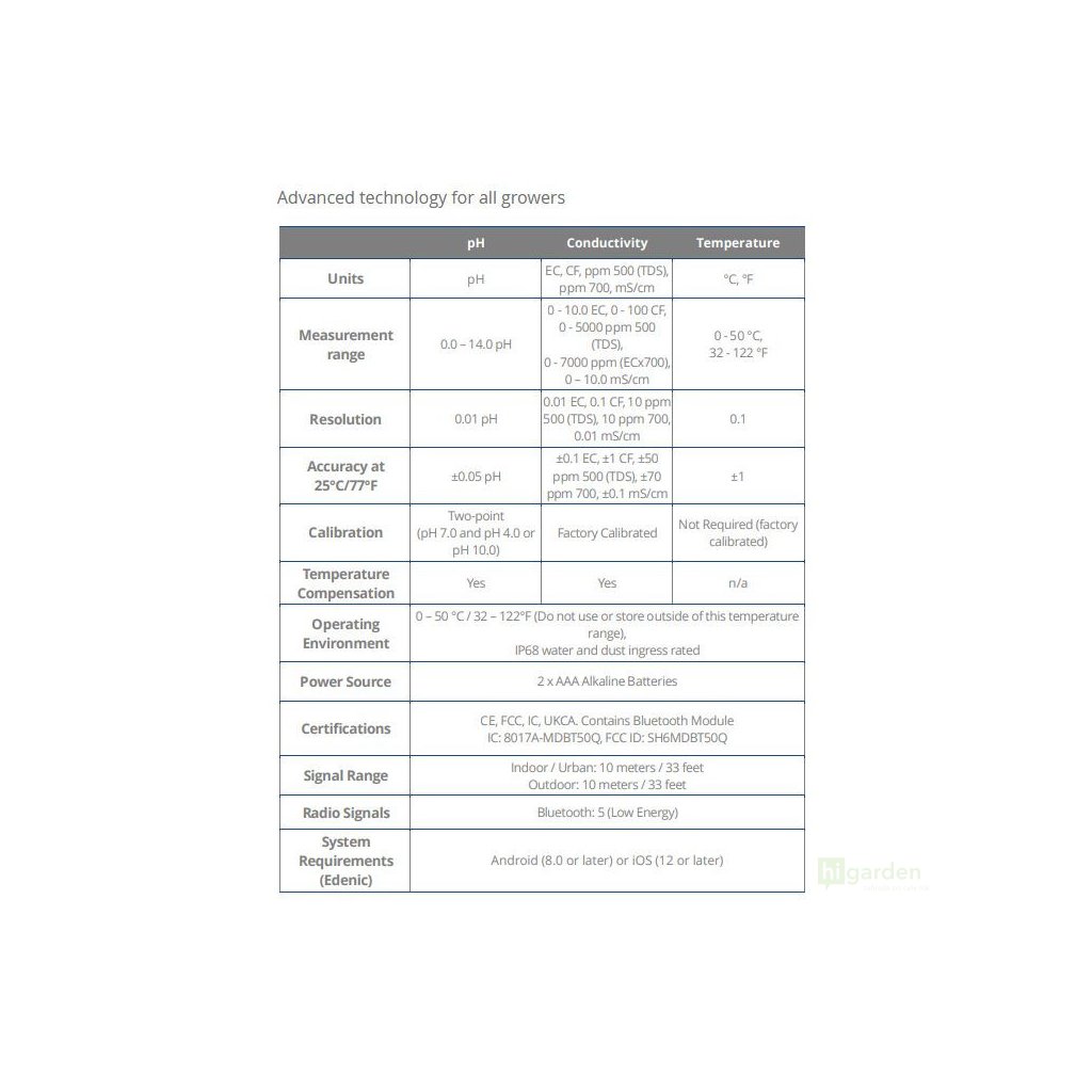Wysokiej jakości miernik 3 w 1, który jednocześnie mierzy pH, przewodność (EC/PPM), temperaturę i pomaga w przyswajaniu składników odżywczych. Połącz się z aplikacją Edenic przez Bluetooth, aby udostępniać dane, aktualizować oprogramowanie i zarządzać nimi w czasie rzeczywistym.