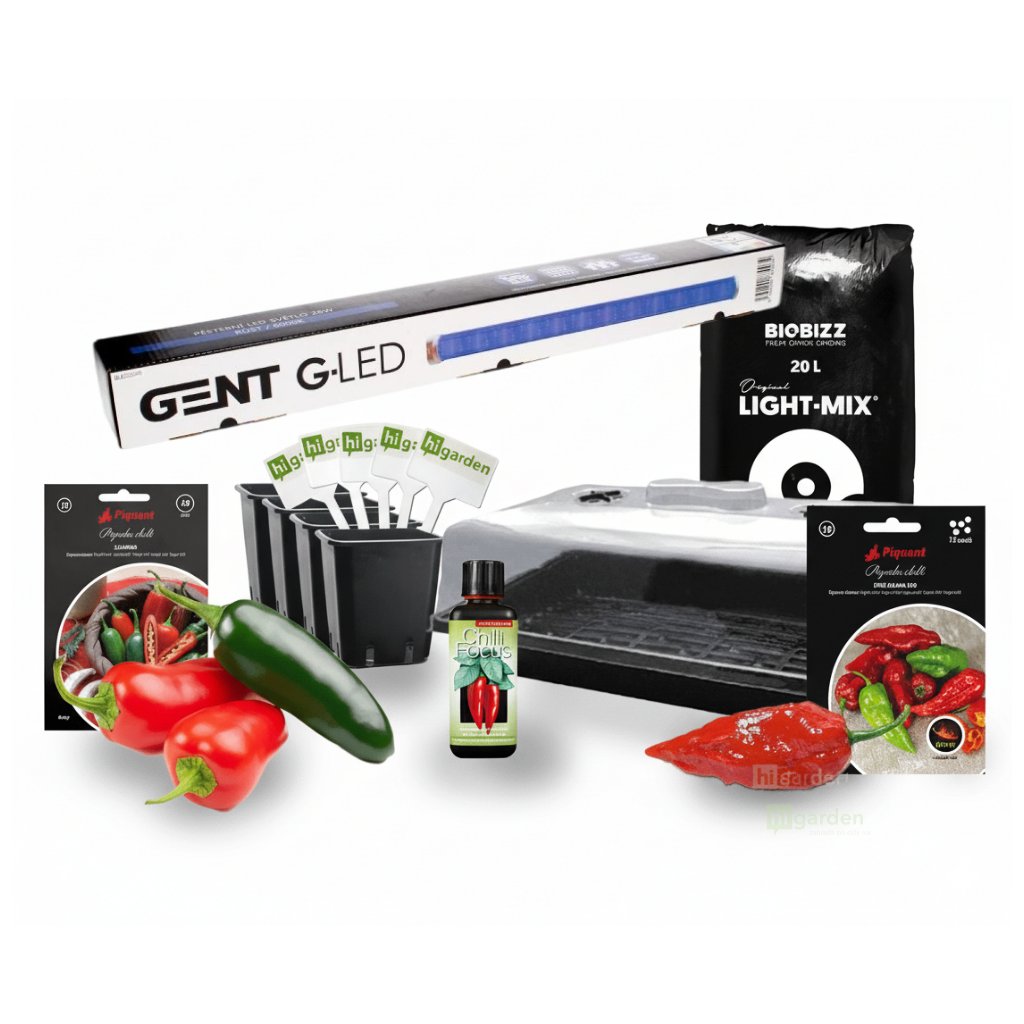 Zestaw w promocyjnej cenie do wstępnej uprawy papryczek chilli. Zawiera nasiona dwóch odmian papryczek chilli, podłoże, doniczki, mini szklarenkę, oświetlenie do sadzonek wraz z mechanicznym timerem oraz etykiety do oznaczania roślin.